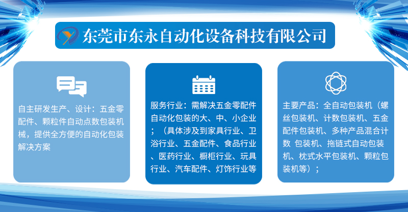 东莞市东永自动化设备科技有限公司自主研发生产的自动螺丝包装机,针对于家具、卫浴、锁业、电工、电器、灯饰、五金建材等制造工业的附属安装螺丝、五金配件,可自动完成计量、计数、制袋、充填、封和、切袋等工序。本机技术先进、操作方便、工作稳定,替代了预制袋成形方式,大大提高了工作效率,成功应用于各大型知名企业的附件自动包装。